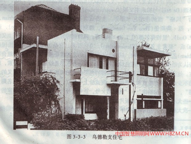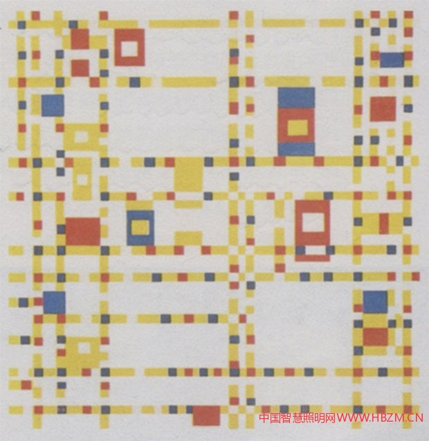 抽象派畫家及風格派建筑師蒙德里安則提出單色(純色)的概念:繪畫是由線條和顏色構成的,所以線條和顏色是繪畫的本質(zhì)與要素。用最簡單的幾何形和最純粹的色彩組成的構圖才是具有普遍意義的永恒的繪畫。他的不少畫就只有垂直和水平線條,因此,我們可以認為現(xiàn)代建筑的許多立面構圖就是風格派畫家蒙德里安的繪畫的“立體化” (里特弗爾德)。他的兩維空間是視覺抽象構圖,變成三維后才能成為視覺構圖。