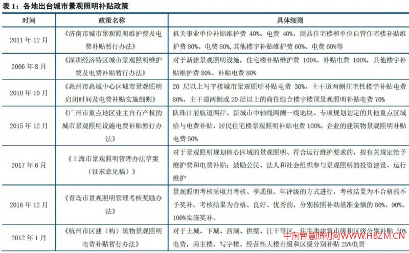 2010 年5月,住房和城鄉(xiāng)建設(shè)部頒布《城市照明管理規(guī)定》,文件指出政府預(yù)算安排的城市照明設(shè)施運行維護(hù)費用應(yīng)當(dāng)專款專用,保證城市照明設(shè)施的正常運行;國家鼓勵社會資金用于城市照明設(shè)施的建設(shè)和維護(hù)。各地也相繼出臺了相關(guān)補(bǔ)貼政策,支持城市景觀照明的建設(shè);撥付的維護(hù)補(bǔ)貼資金、電費補(bǔ)貼資金作為景觀照明建設(shè)單位專用資金,專款專用,確保景觀照明設(shè)施的完好及正常運行。