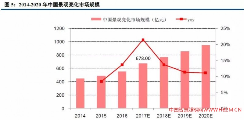政府為景觀照明設(shè)置??顚m棧瑵?jì)南、深圳、青島、杭州等地還對景觀照明后期的電費或維護(hù)費用實施補(bǔ)貼。根據(jù)CSA的數(shù)據(jù),2016年半導(dǎo)體照明產(chǎn)業(yè)應(yīng)用規(guī)模達(dá)到4286億元,其中景觀應(yīng)用照明占比13.5%,即579億元。高工產(chǎn)研的數(shù)據(jù)也顯示,2016年中國景觀亮化市場規(guī)模達(dá)到558億元,預(yù)計十三五期間仍能保持10%以上的增速,至2020年行業(yè)規(guī)模達(dá)到954億元。