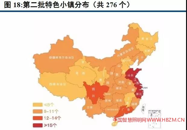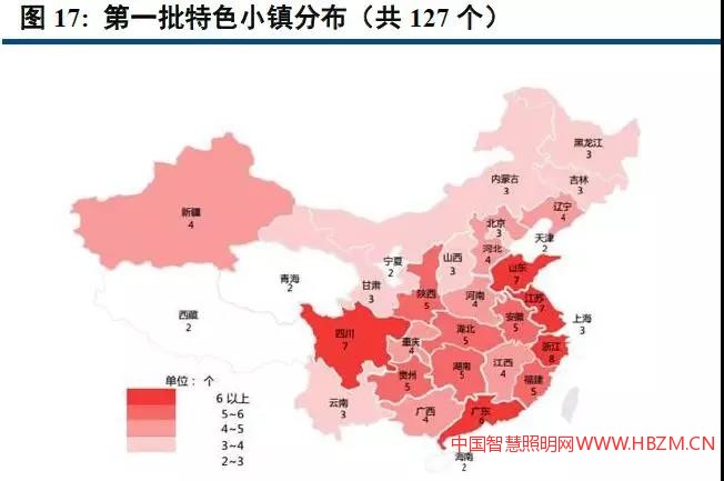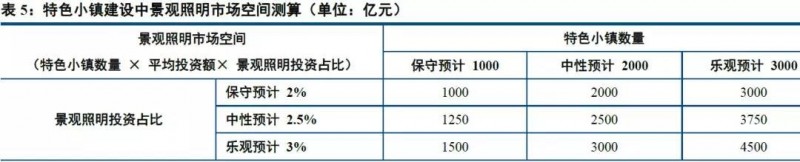 國家規(guī)劃至2020年培育1000個左右的特色小鎮(zhèn),目前批復(fù)了403家,單個特色小鎮(zhèn)平均投資額50億左右,景觀照明占比約為2%-3%,我們認(rèn)為特色小鎮(zhèn)建設(shè)帶來的景觀照明市場空間約1000-4500億元。