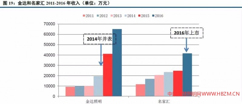 一般來講,國內(nèi)的景觀照明企業(yè)在僅憑借自身信貸和資金實力的競爭狀態(tài)下,業(yè)務(wù)規(guī)模都較小,年收入約1-2億元;而當(dāng)企業(yè)登陸資本市場,獲得資金實力后,往往能夠取得飛速發(fā)展,典型的案例就是金達(dá)照明和名家匯。金達(dá)被利亞德收購,在2014年實現(xiàn)并表,2015和2016年金達(dá)的收入增速分別達(dá)到111%和58%,而在被并購之前金達(dá)的收入體量維持在1億元左右;名家匯在2016年初上市,當(dāng)年收入增速達(dá)到68%,遠(yuǎn)高于上市之前的收入增長速度。