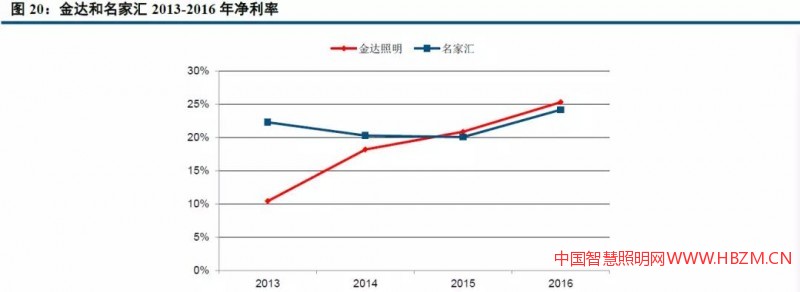 ②景觀照明是資金驅(qū)動行業(yè),對企業(yè)的資金周轉(zhuǎn)能力要求較高。而當(dāng)企業(yè)登陸資本市場,獲得資金實力后,往往能夠取得飛速發(fā)展,典型的案例就是金達(dá)照明和名家匯;且獲得資金支持后,企業(yè)容易“滾雪球”,實現(xiàn)規(guī)模效應(yīng),盈利能力(凈利率)將得到提升。